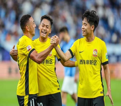 9月28日,青岛西海岸队球员戴维森(左一)在比赛中与队友庆祝进球。 当日,在广东深圳举行的2025赛季中国足球超级联赛第26轮比赛中,青岛西海岸队客场2比1战胜深圳新鹏城队。 新华社发(彭志刚摄)