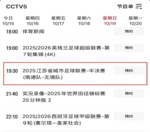 央视五套在18日、19日黄金时段选择直播“苏超”。