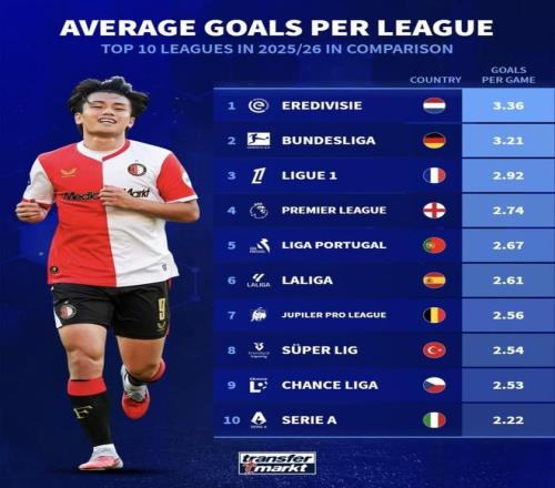 这份榜单最扎眼的地方,其实不是谁排第一,而是“谁被说好看、谁真的在进球”。球迷口碑里,英超是公认的“最好看联赛”,结果场均进球2.74,只排到第4,反而是存在感没那么强的荷甲、德甲一个3.36、一个3.21,火力直接把英超和西甲甩开一截。更讽刺的是,法甲一向被嘲“无聊联赛”,这次场均2.92挤进前三——嘴上嫌弃、身体真香,数据说明大家平时骂得最狠的联赛,有时候反而是进球最多的那个。