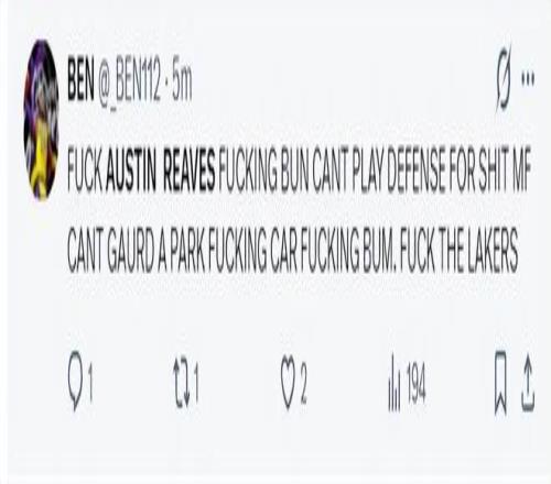 赛后湖人球迷也炮轰里夫斯:去XX的里夫斯,他根本不会防守,他在场上任何一个人他都防不住,FuX混蛋,去XX的湖人队。