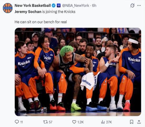尼克斯媒体晒出此前索汉摔在尼克斯板凳席引发骚乱的图片来欢迎索汉,索汉本赛季仅仅代表马刺出战28场比赛,场均只能拿到4.1分2.6篮板1助攻。这位22岁身高2.03米的锋线是2022年首轮第九顺位,在米奇-约翰逊上位后他就被 边缘化,没有投射、缺乏自主进攻能力的弊病无限暴露。
