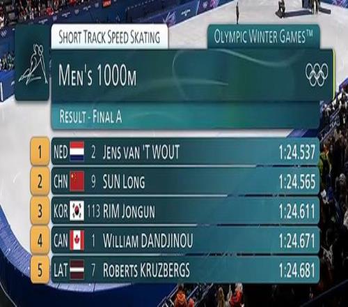 最后一圈,孙龙在最后一个弯道迸发出了巨大的能量!运用极其冒险且勇敢的方式在外道超越加拿大选手丹津诺来到第二,并且将这一位置保持到了最后!最终,他以0.028秒之差获得短道速滑男子1000米亚军,为中国短道速滑队斩获本届冬奥会的首枚奖牌!