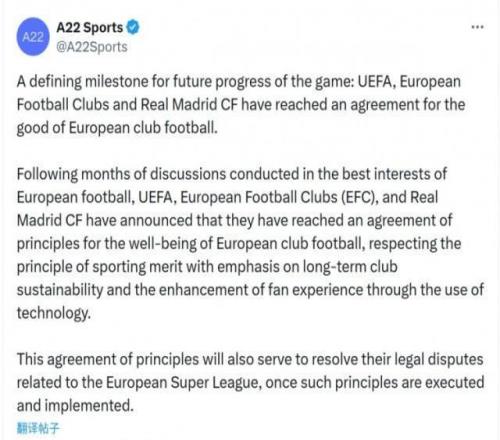 2月13报道 欧超公司A22社媒发表声明,确认欧足联、皇马、欧洲俱乐部协会达成原则协议,正式终结持续5年的欧超联赛项目及相关法律纠纷。“足球运动未来发展的里程碑:欧足联、欧洲俱乐部协会与皇马已达成有利于欧洲俱乐部足球发展的协议。历经数月以欧洲足球最佳利益为宗旨的磋商,欧足联、欧洲俱乐部协会与皇马宣布达成原则性协议,旨在保障欧洲俱乐部足球的健康发展。该协议恪守竞技价值原则,着重提升俱乐部长期可持续性,并通过技术手段优化球迷观赛体验。该原则性协议在落实执行后,也将有助于解决欧洲超级联赛的相关法律纠纷。”